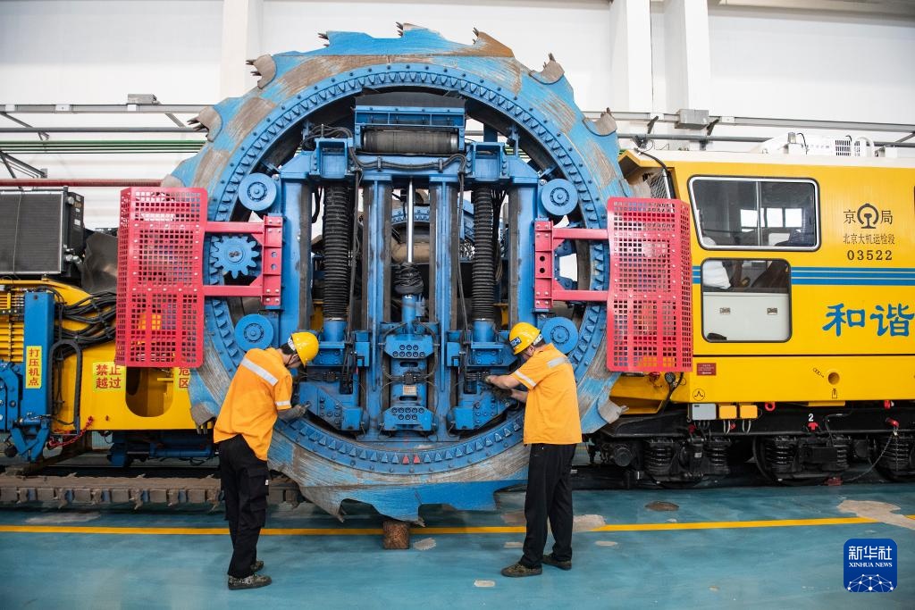 7月25日,在国铁北京局北京大型养路机械运用检修段的检修库,职工安装机械车传动轴。