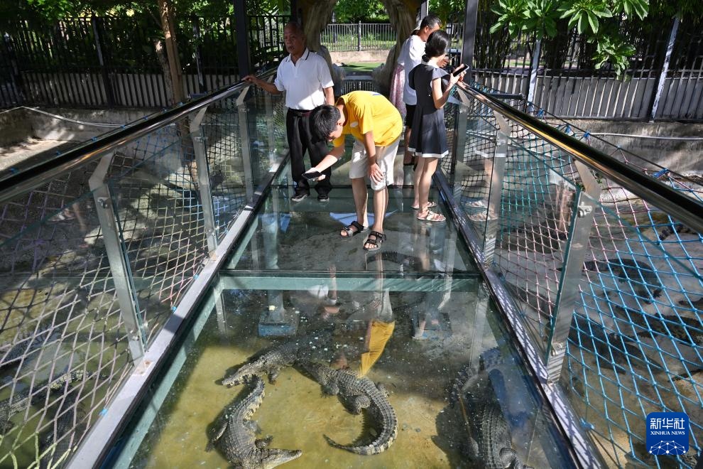 7月24日,游客在东方市三家镇鳄珍鳄鱼园游玩。