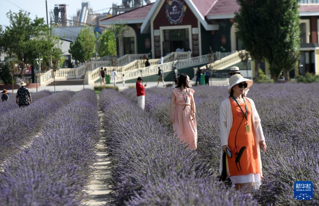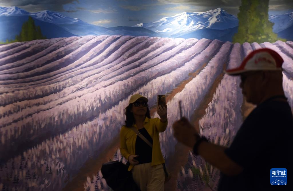游客在新疆霍城县薰衣草博物馆游玩(7月26日摄)。