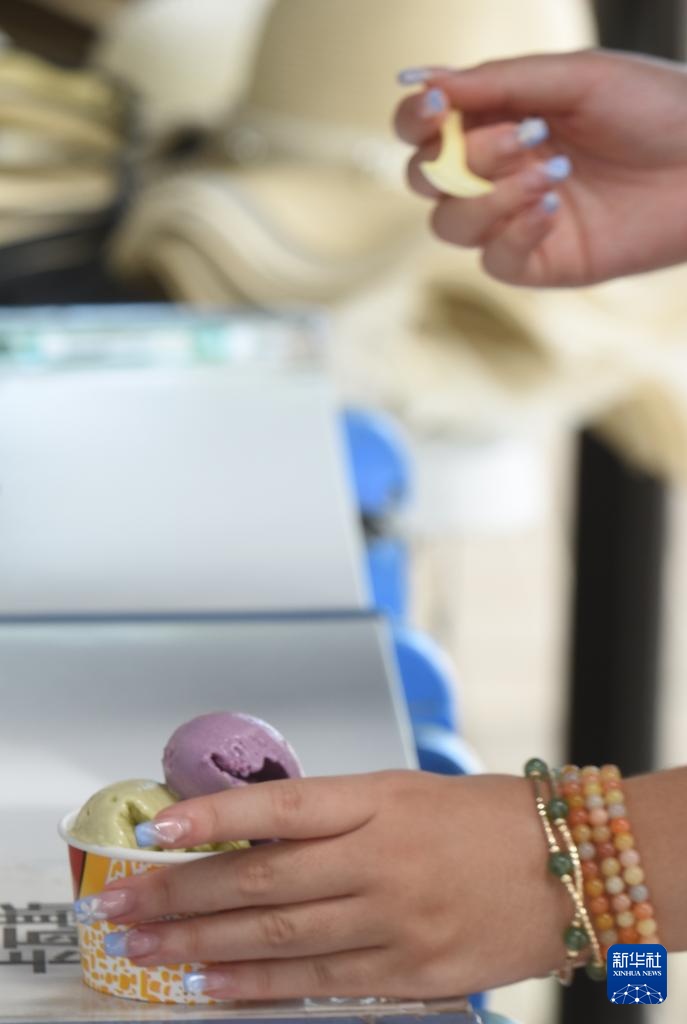 在新疆霍城县,游客在品尝薰衣草混合口味冰淇淋(7月26日摄)。