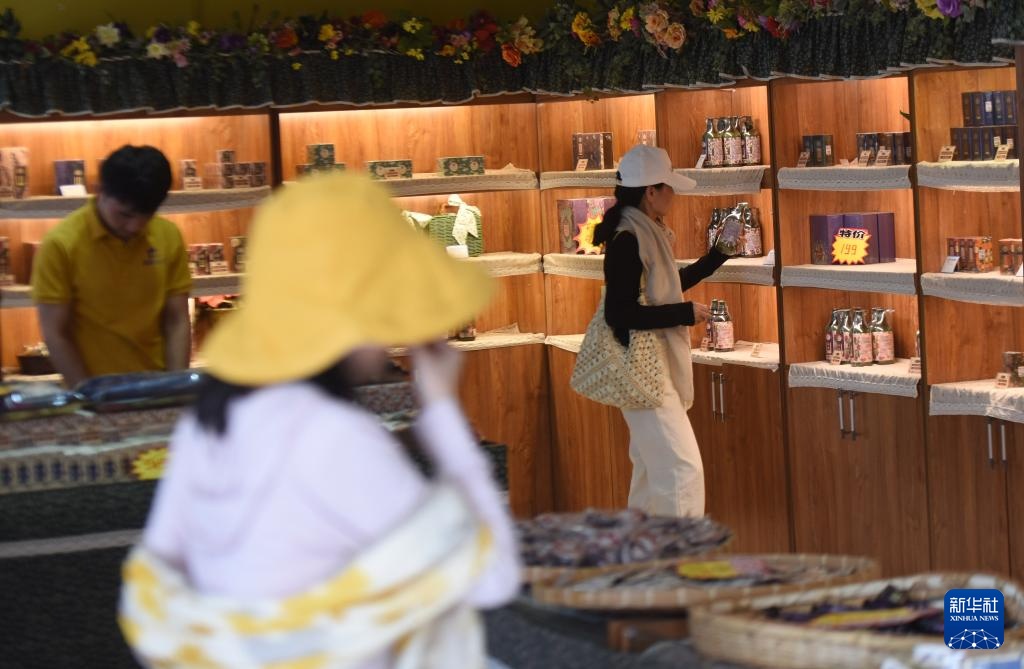 游客在新疆霍城县薰衣草农场购买薰衣草产品(7月26日摄)。
