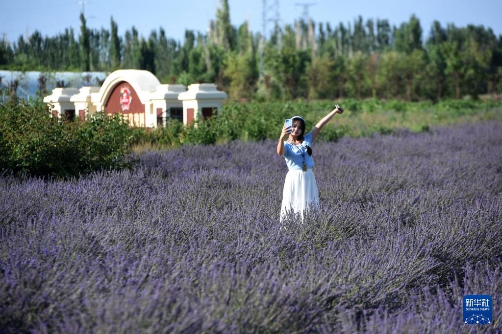 游客在新疆霍城县薰衣草农场拍照(7月26日摄)。