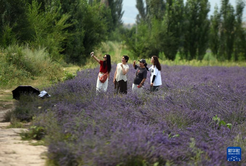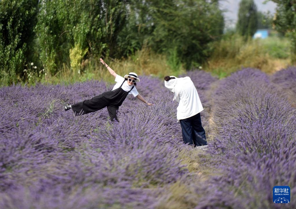 游客在新疆霍城县一片薰衣草花田拍照(7月26日摄)。