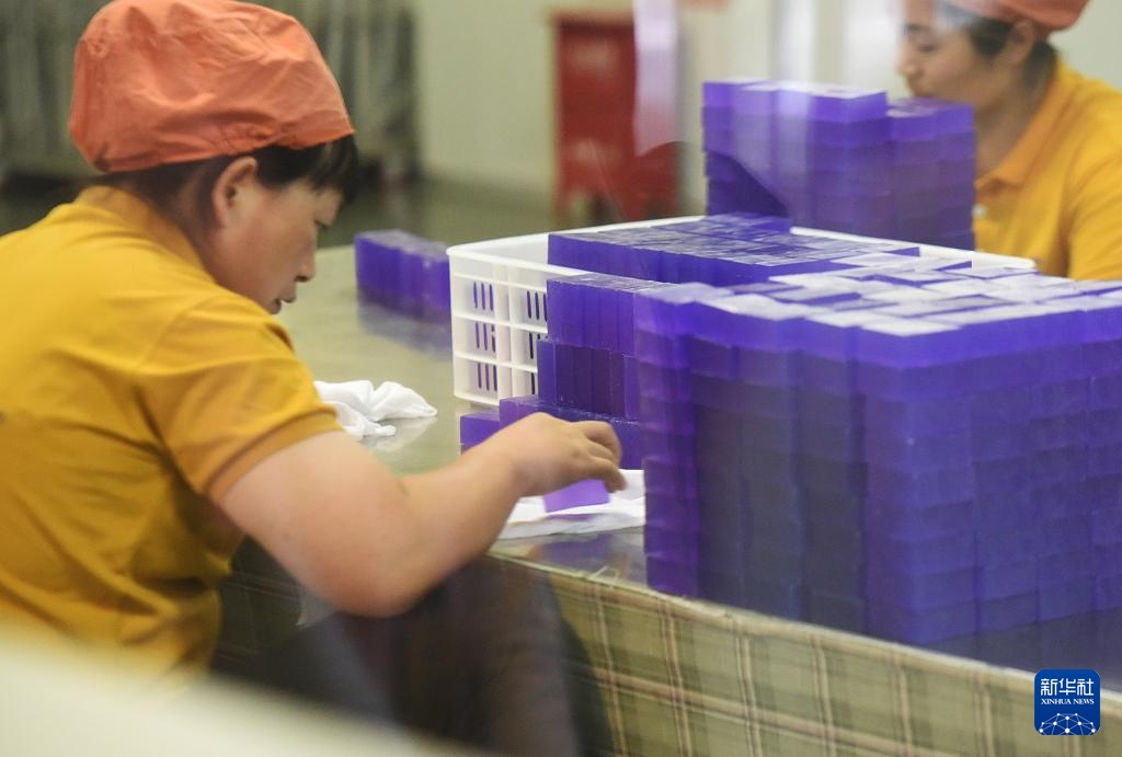 在新疆霍城县薰衣草博物馆,工人在加工薰衣草香皂(7月26日摄)。