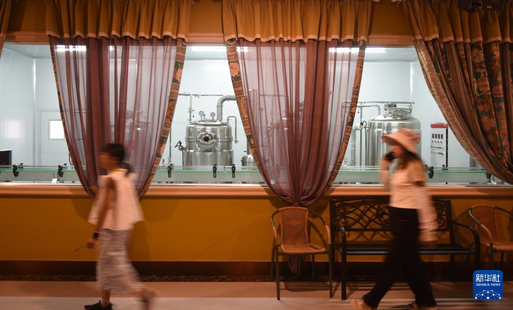 在新疆霍城县薰衣草博物馆,游客经过薰衣草生产车间(7月26日摄)。