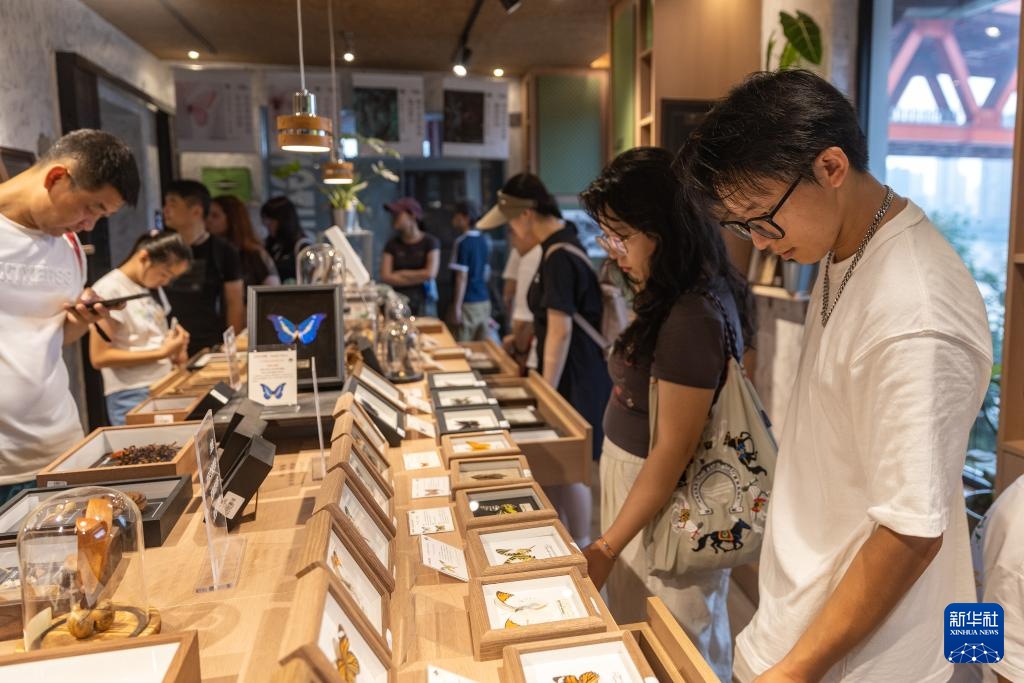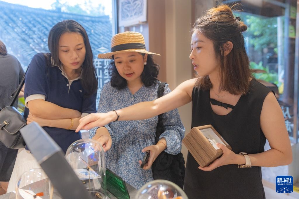 7月28日,在龙门浩老街·下浩里,青年创业者曾进(右一)在她的工作室内为游客讲解标本知识。