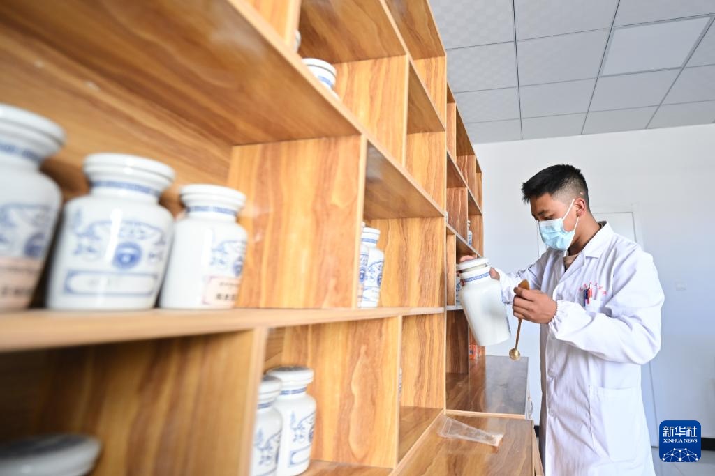 7月31日,青海省果洛藏族自治州达日县窝赛乡卫生院医生华多在为患者配藏药。