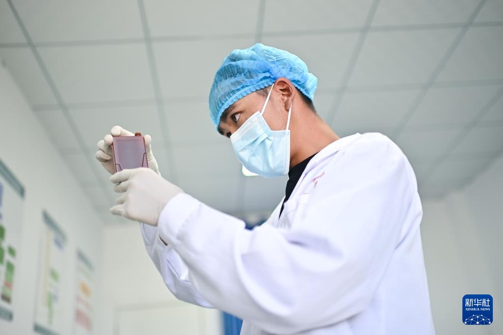 7月31日,青海省果洛藏族自治州达日县窝赛乡卫生院医生格桑冷智在进行医学检验。