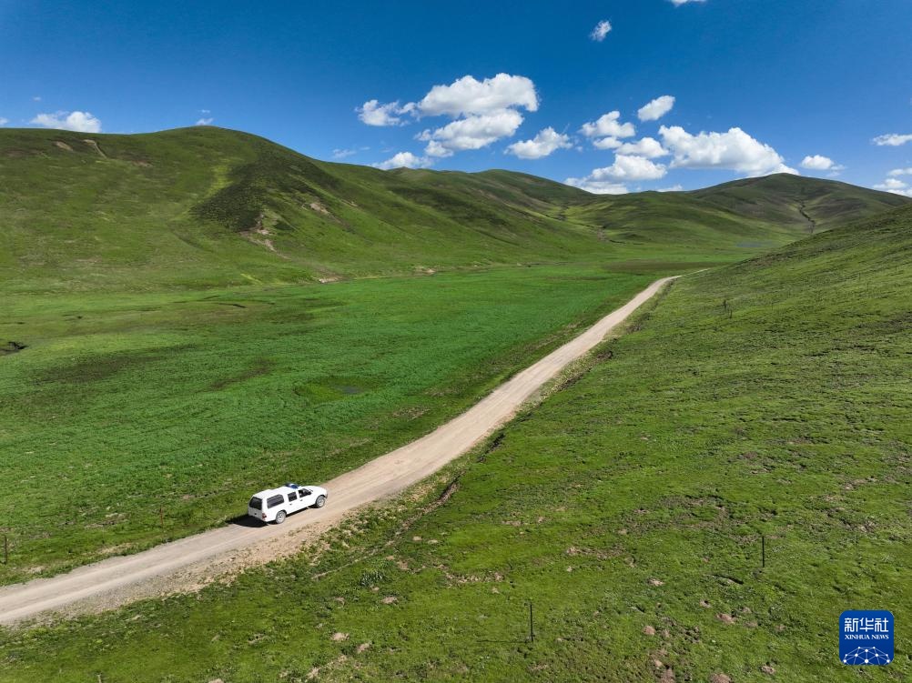 7月31日,青海省果洛藏族自治州达日县窝赛乡卫生院医疗巡回车前往牧民夏季草场开展公共卫生服务(无人机照片)。