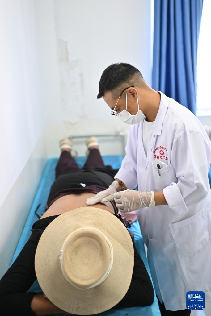 7月31日,青海省果洛藏族自治州达日县窝赛乡卫生院医生夏吾南加在为患者进行藏医理疗。