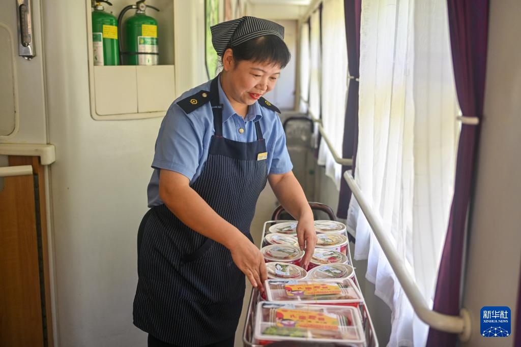 8月1日,在K210次列车上,杭州客运段工作人员将制作完成的儿童套餐放入小推车,准备前往车厢销售。