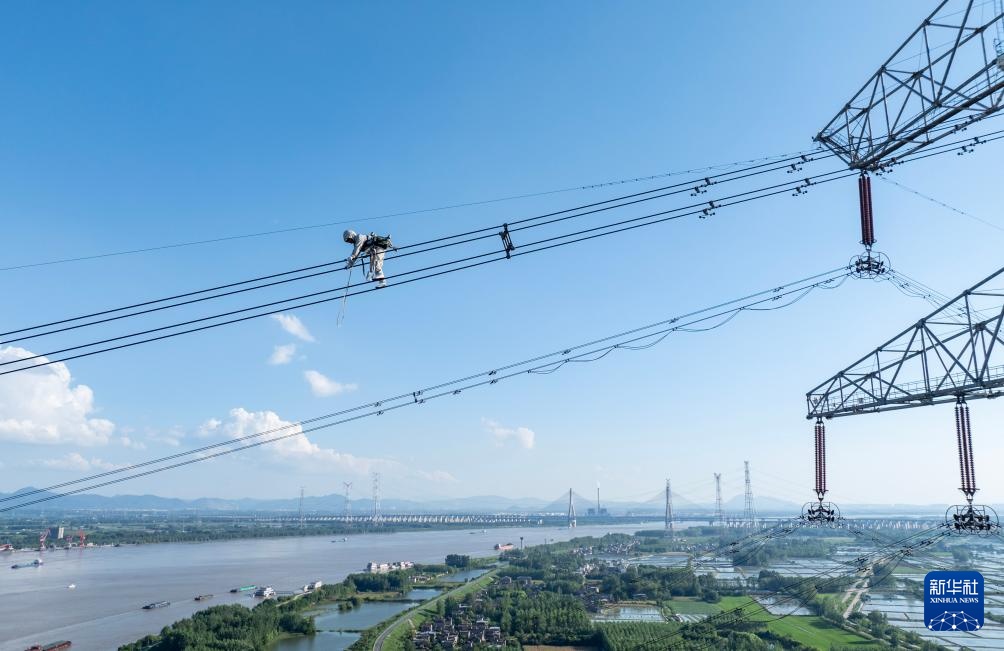 8月1日,在位于安徽芜湖无为市高沟镇的500千伏肥繁5305线长江大跨越北塔,安徽送变电工程有限公司检修工人对线路进行带电检修(无人机照片)。
