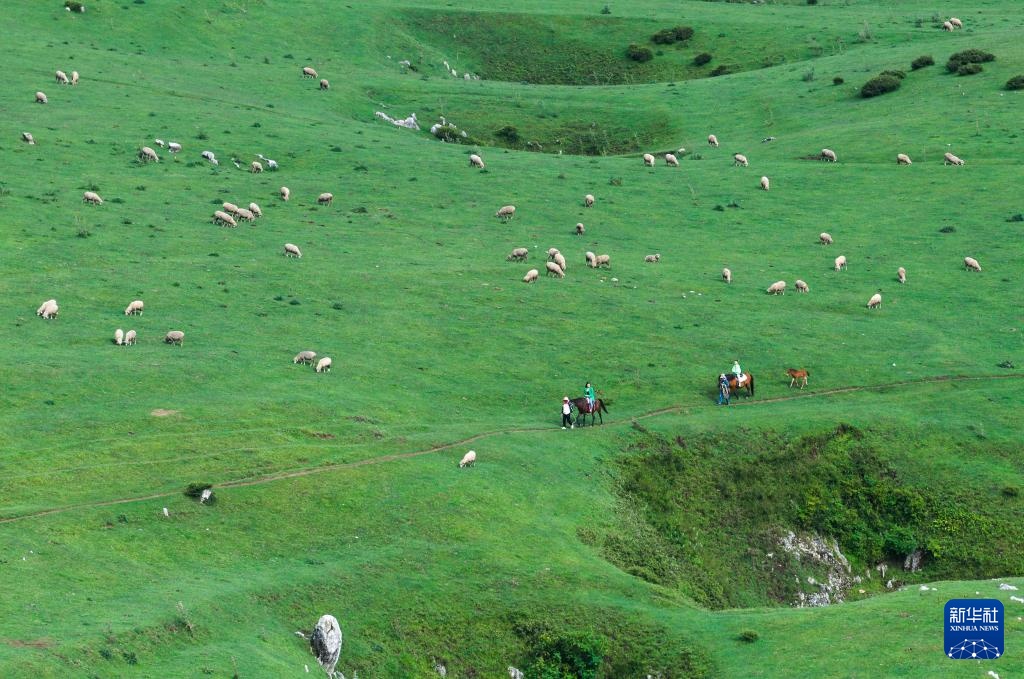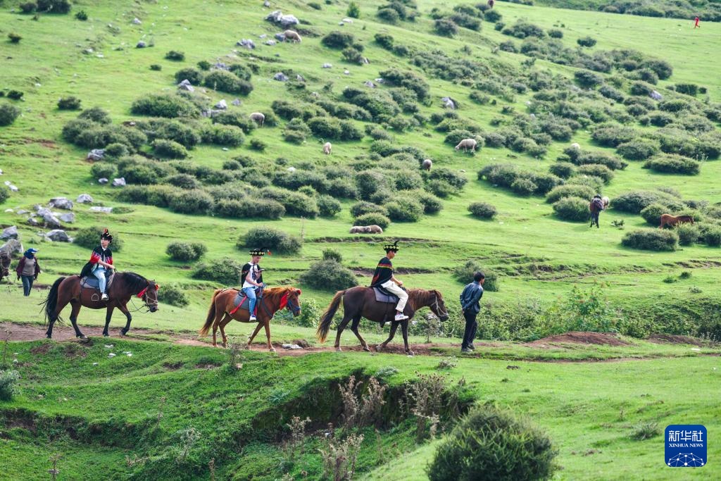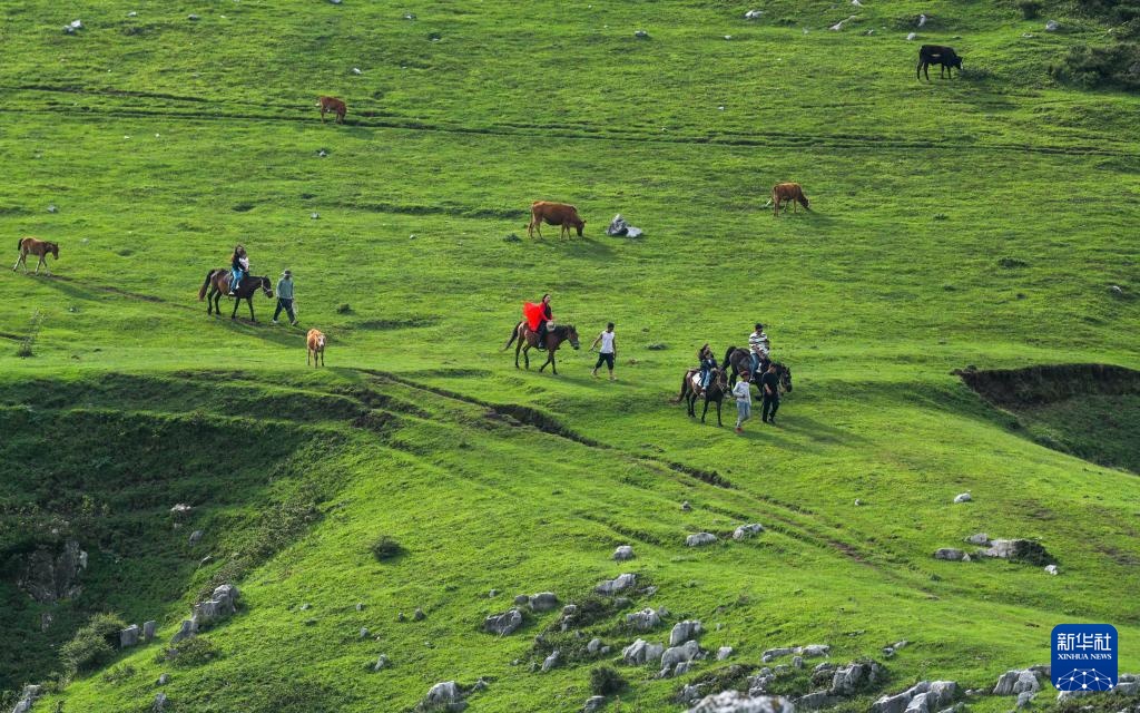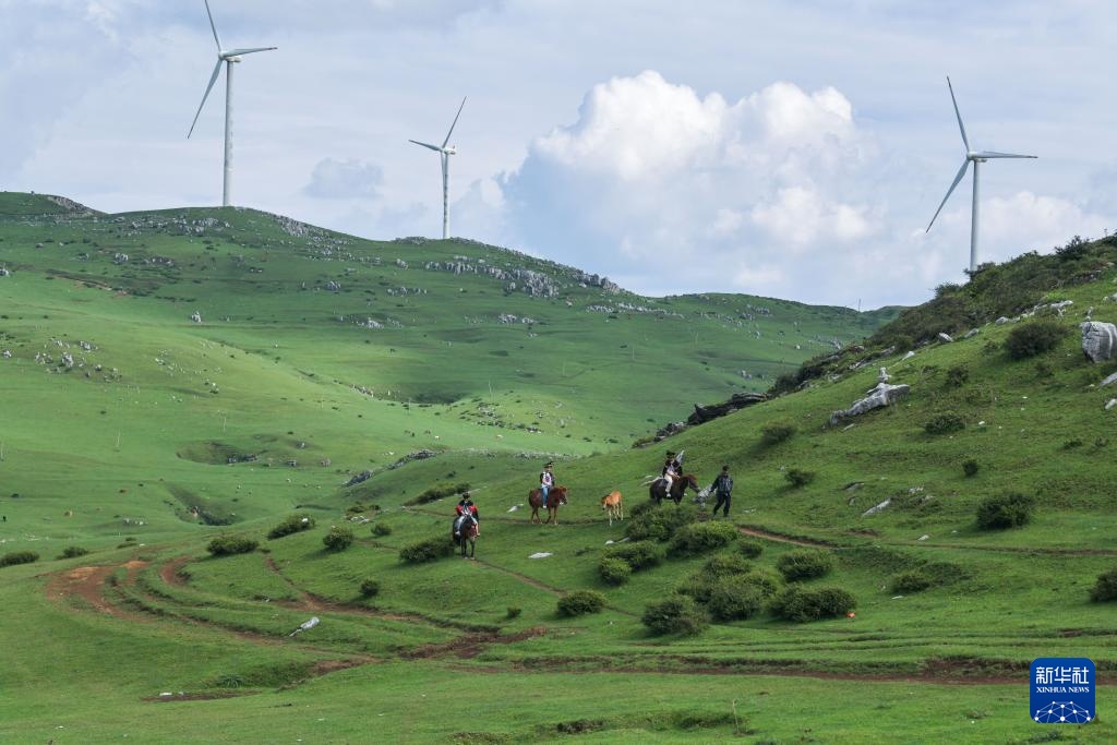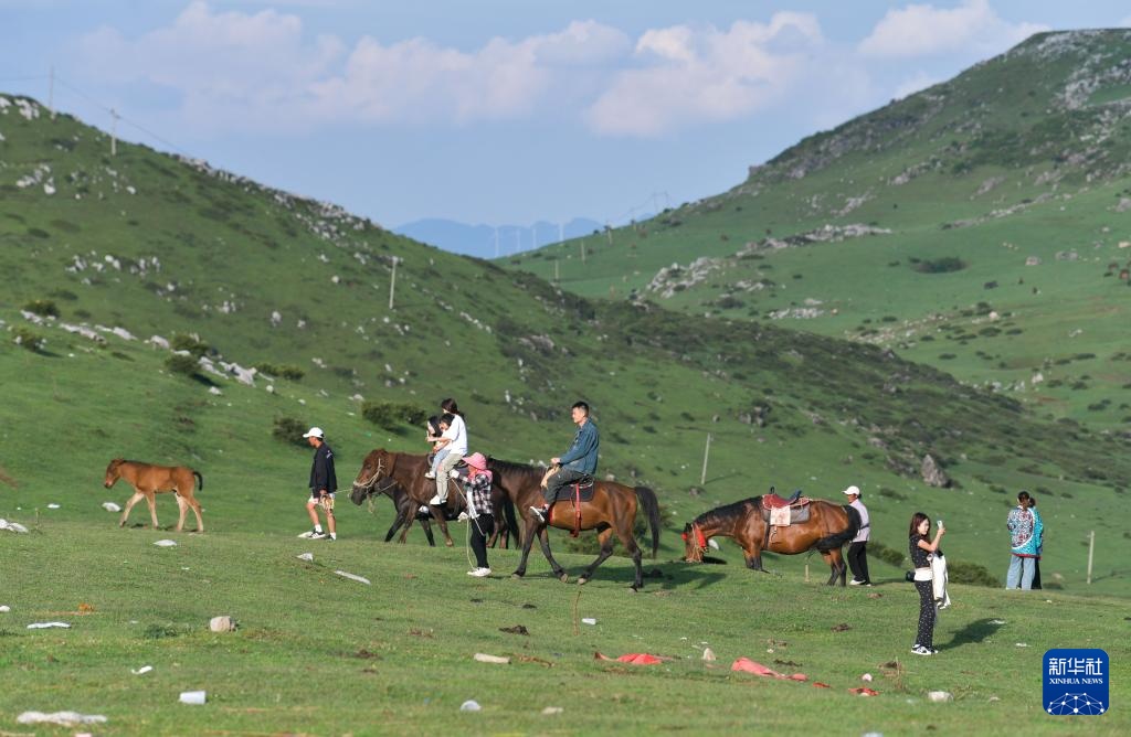 7月31日,游客在贵州省威宁县百草坪景区骑马观光。