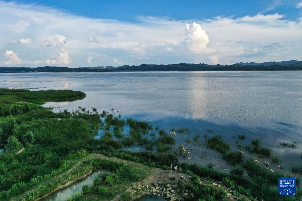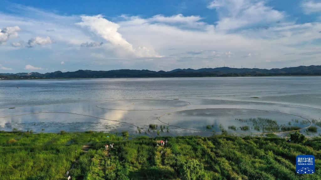 8月1日,游客在贵州省威宁县草海景区观光(无人机照片)。