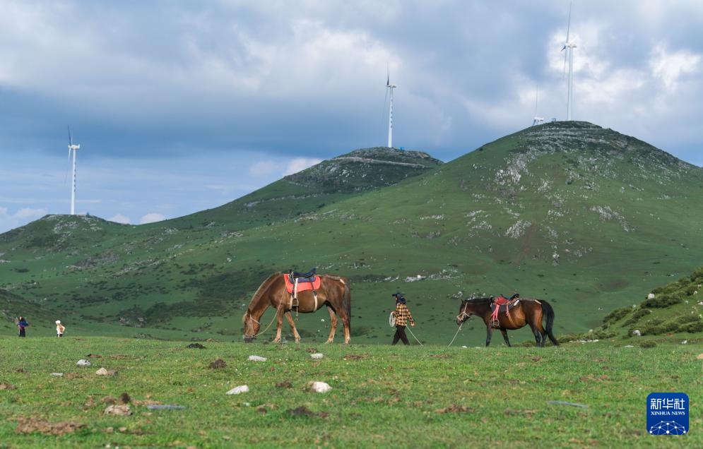 7月31日,村民在贵州省威宁县百草坪景区给游客准备马匹。