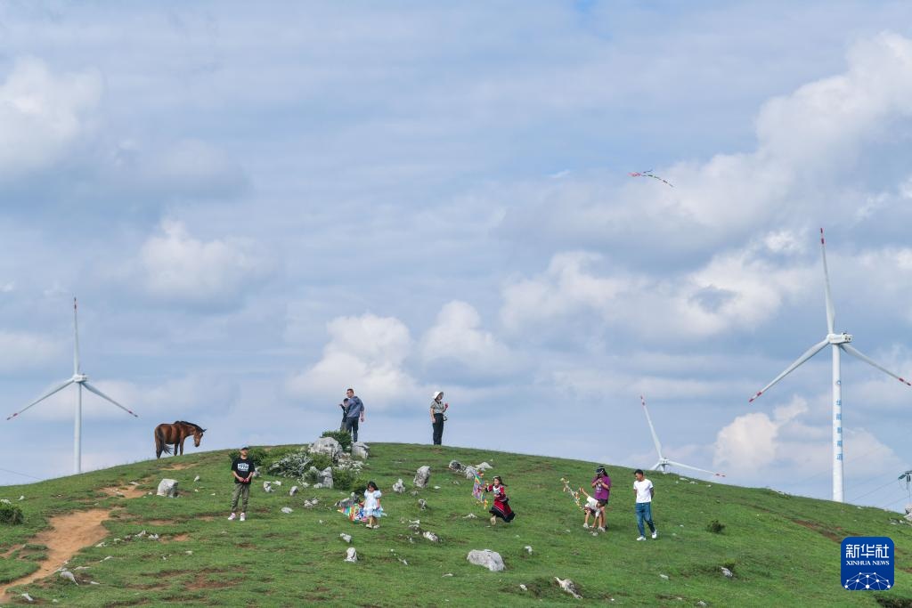 7月31日,游客在贵州省威宁县百草坪景区放风筝。