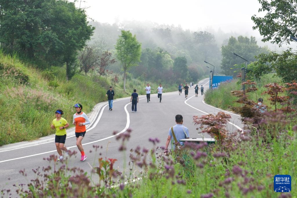 8月1日,人们在贵州省威宁县草海北坡生态公园晨练。