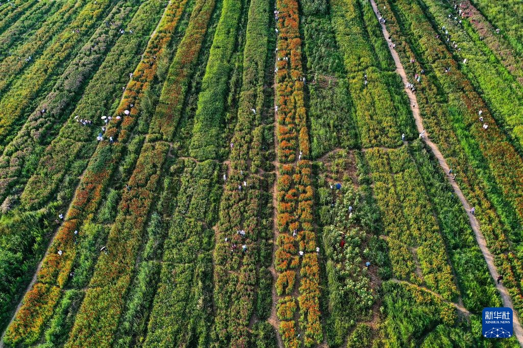 8月1日,游客在贵州省威宁县草海景区的花海中游玩(无人机照片)。
