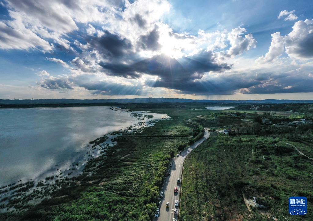 8月1日,游客驾驶汽车行驶在贵州省威宁县草海景区环海路上(无人机照片)。