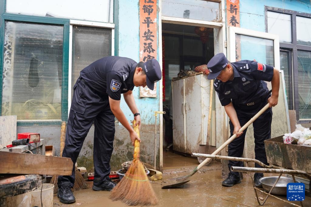 8月2日,临城边境派出所民警在临城村清理农户家中的淤泥。
