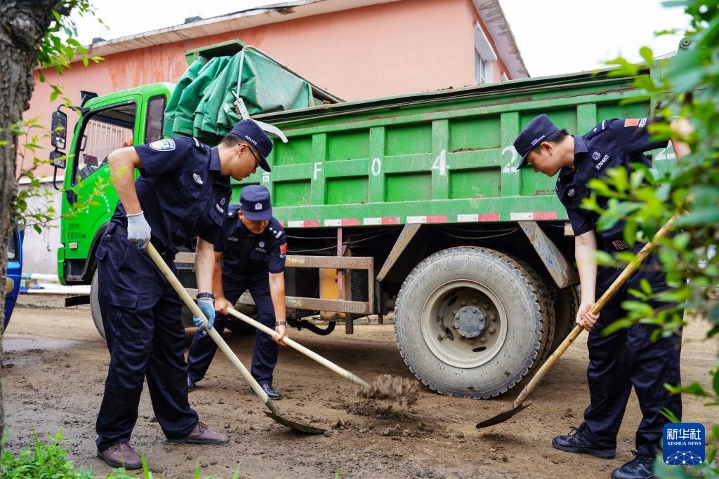 8月2日,临城边境派出所民警在临城村清理村路上的淤泥。