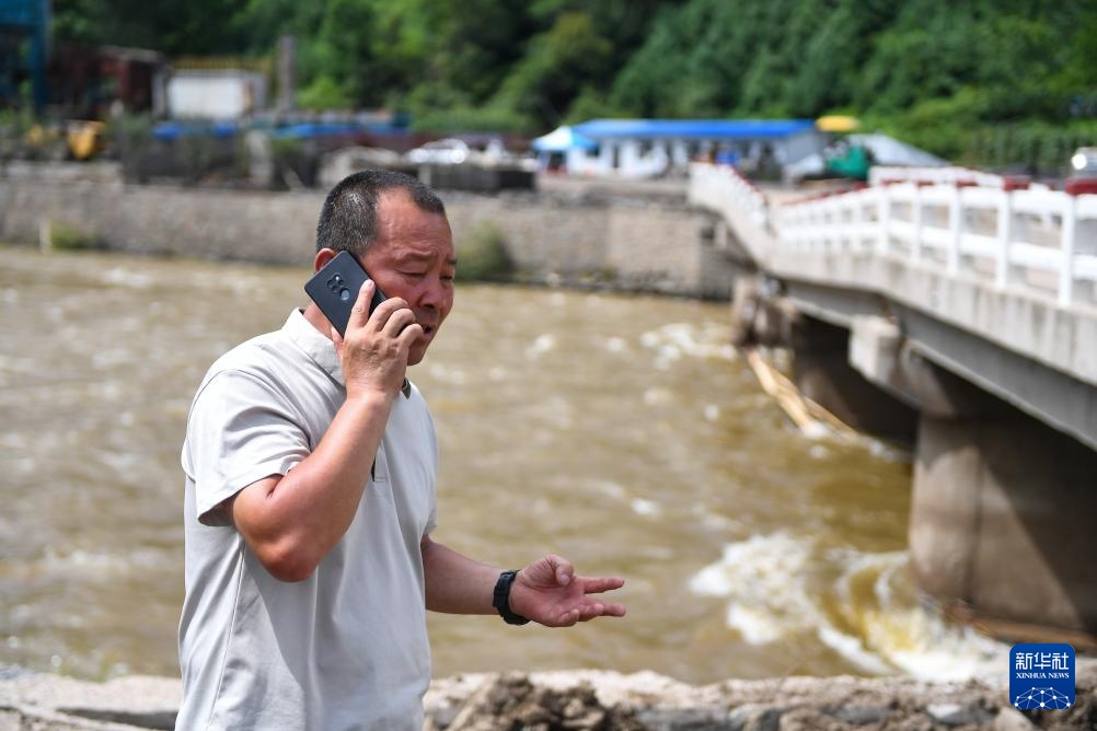 7月31日,临城村党支部书记金勇诚通过电话向有关部门汇报桥梁受损情况。