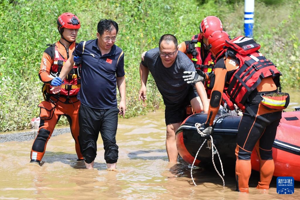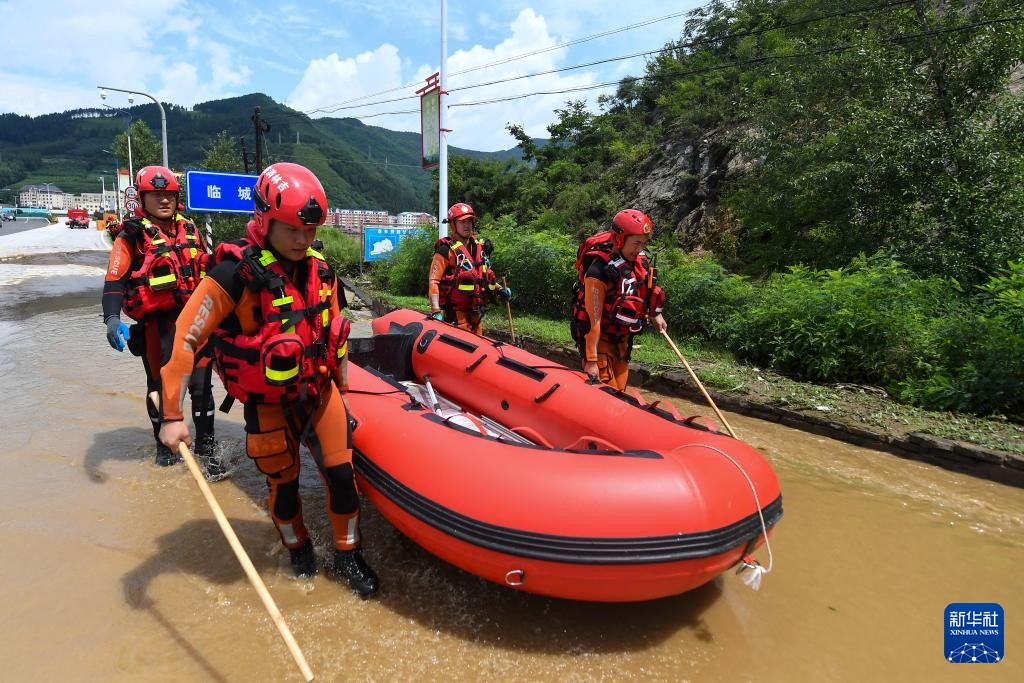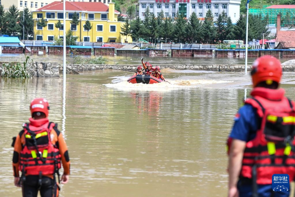 7月29日,临江市消防救援大队世纪大街站消防救援人员在临城村利用橡皮艇转运受困群众。