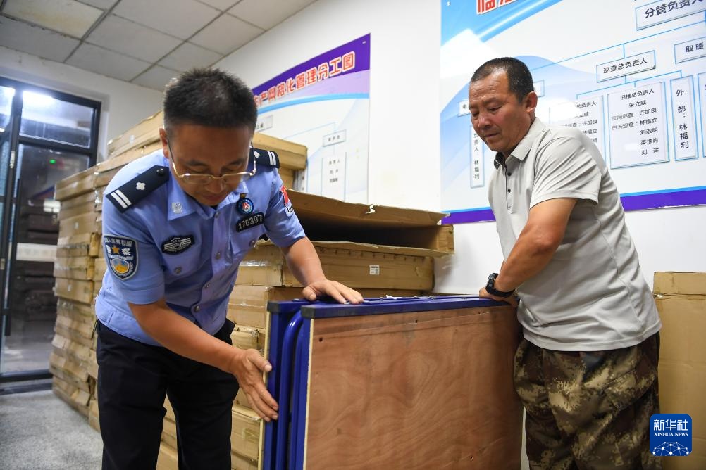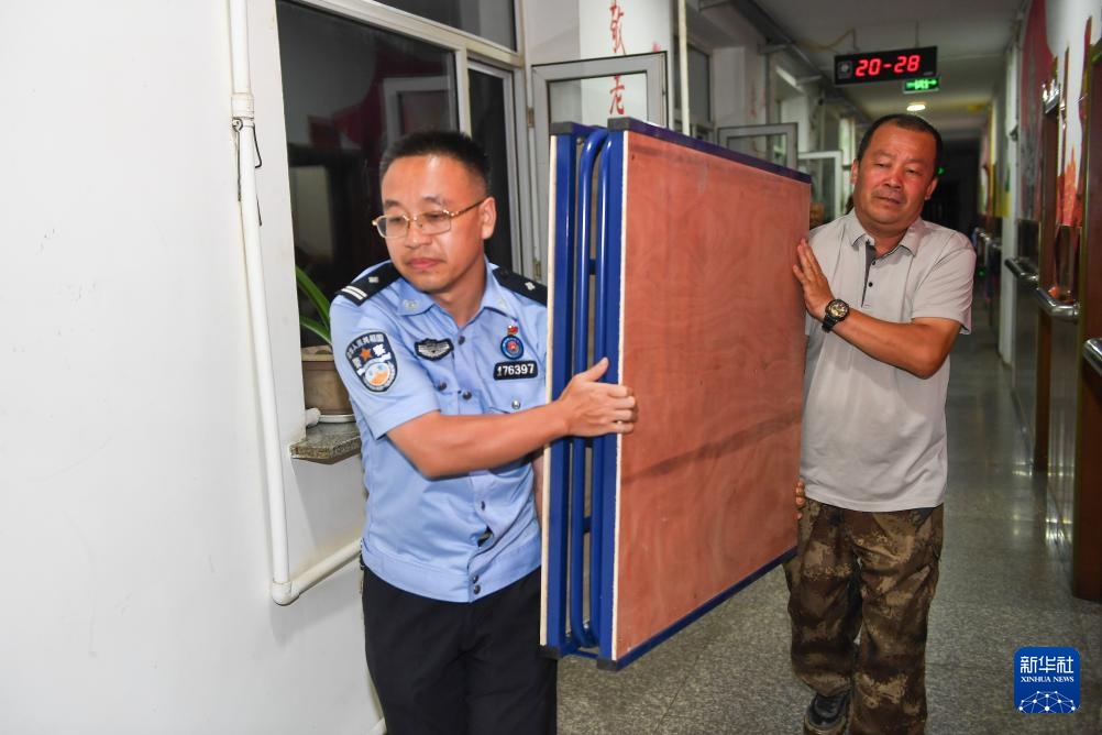 7月30日,在临城村临时安置点,临城边境派出所民警刘伟(左)与村党支部书记金勇诚为村民搬运折叠床。