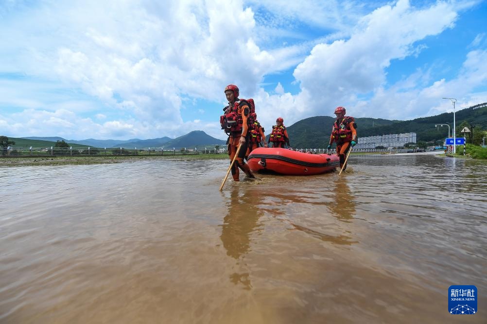 7月29日,临江市消防救援大队世纪大街站副站长白云天(右一)带领队员在临城村探查路面水情。
