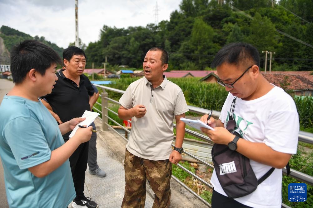 7月31日,临城村党支部书记金勇诚(右二)向临江市水利局的专家介绍供水管道的受损情况。