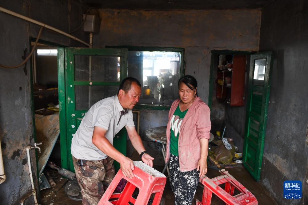 7月31日,临城村党支部书记金勇诚(左)查看村民家中损失情况。
