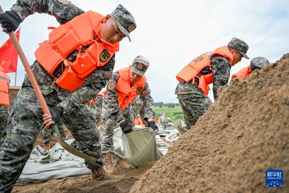 8月2日,武警内蒙古总队通辽支队官兵在东辽河大堤上装沙袋封堵渗漏点。