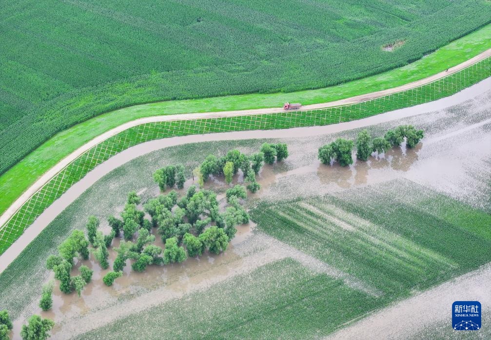 8月2日,当地巡防人员在东辽河大堤上巡护(无人机照片)。