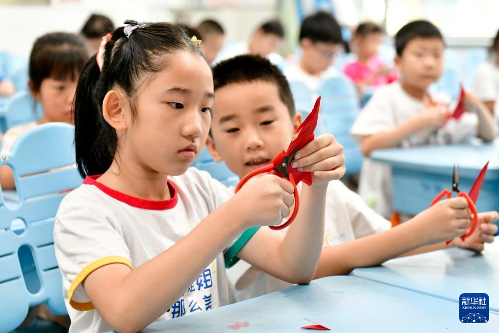 8月2日,在山东省济宁市任城区观音阁街道琵琶山社区“七彩暑托班”,孩子们在剪纸。