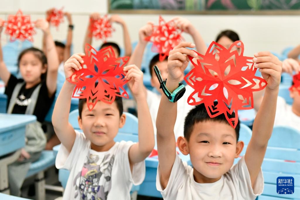 8月2日,在山东省济宁市任城区观音阁街道琵琶山社区“七彩暑托班”,孩子们展示自己的剪纸作品。