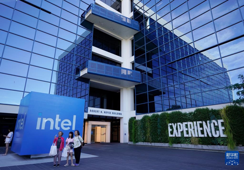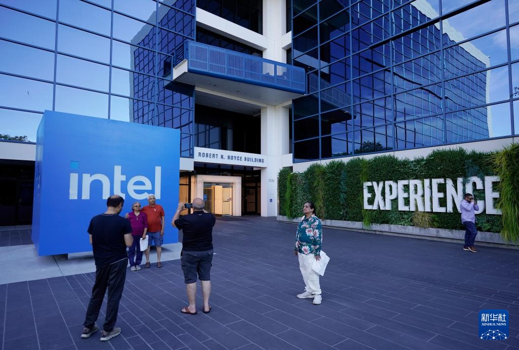 8月1日,游客在美国加利福尼亚州圣克拉拉的英特尔总部留影。
