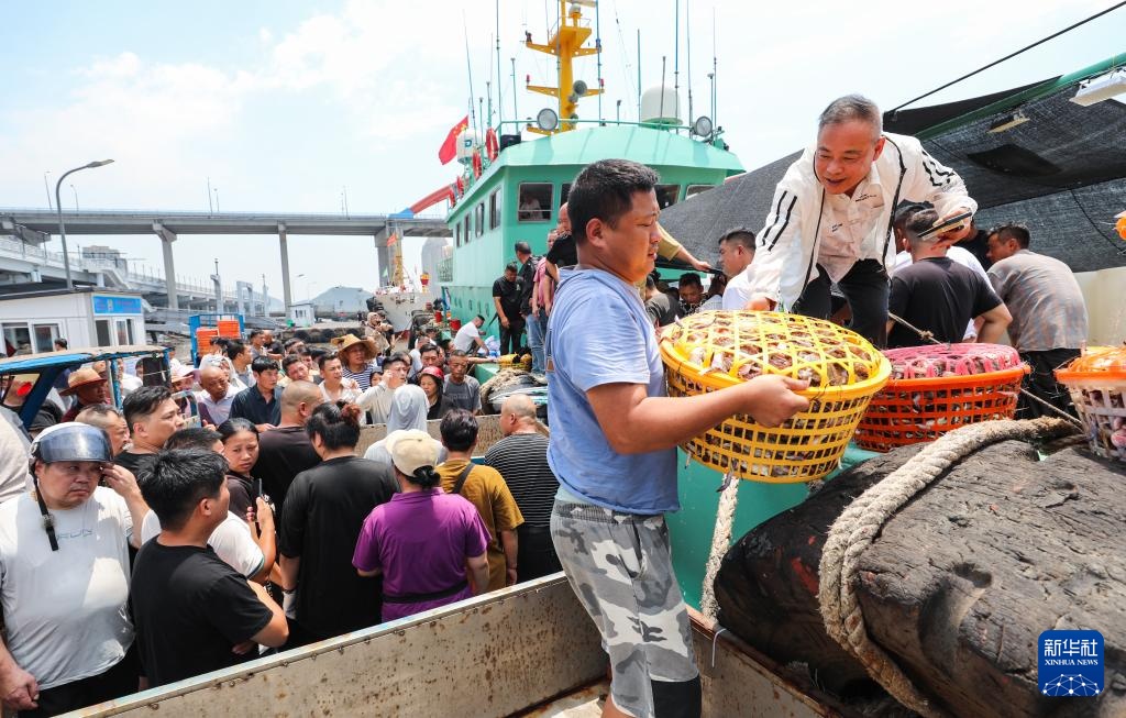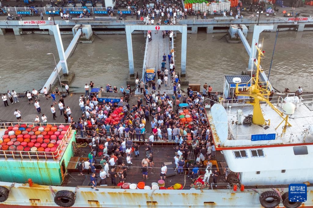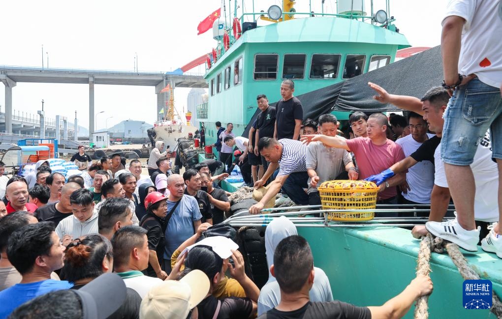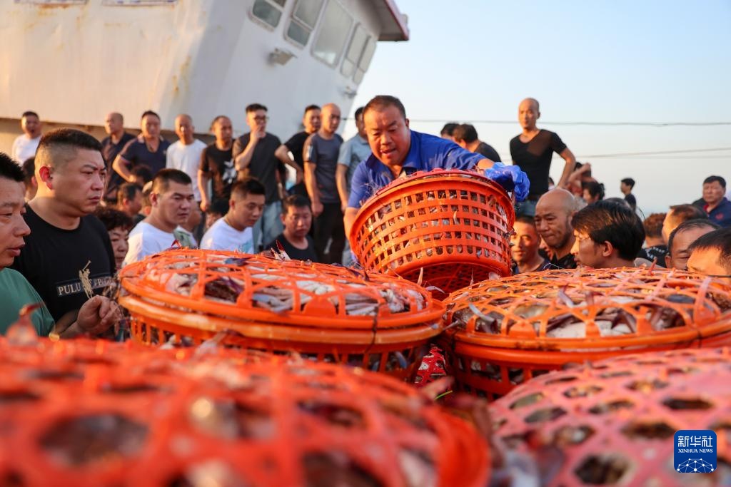 当日,在浙江省舟山市普陀区舟山国际水产城码头,出海的渔船归来,商户们闻“鲜”而至。工人把卸下来的梭子蟹运往水产城内,准备销往各地市场。