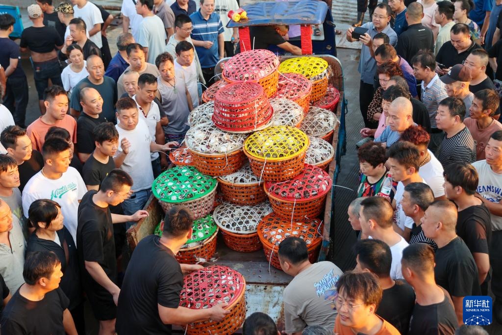8月2日,在浙江省舟山市普陀区舟山国际水产城码头,商贩们“迎接”梭子蟹上岸。