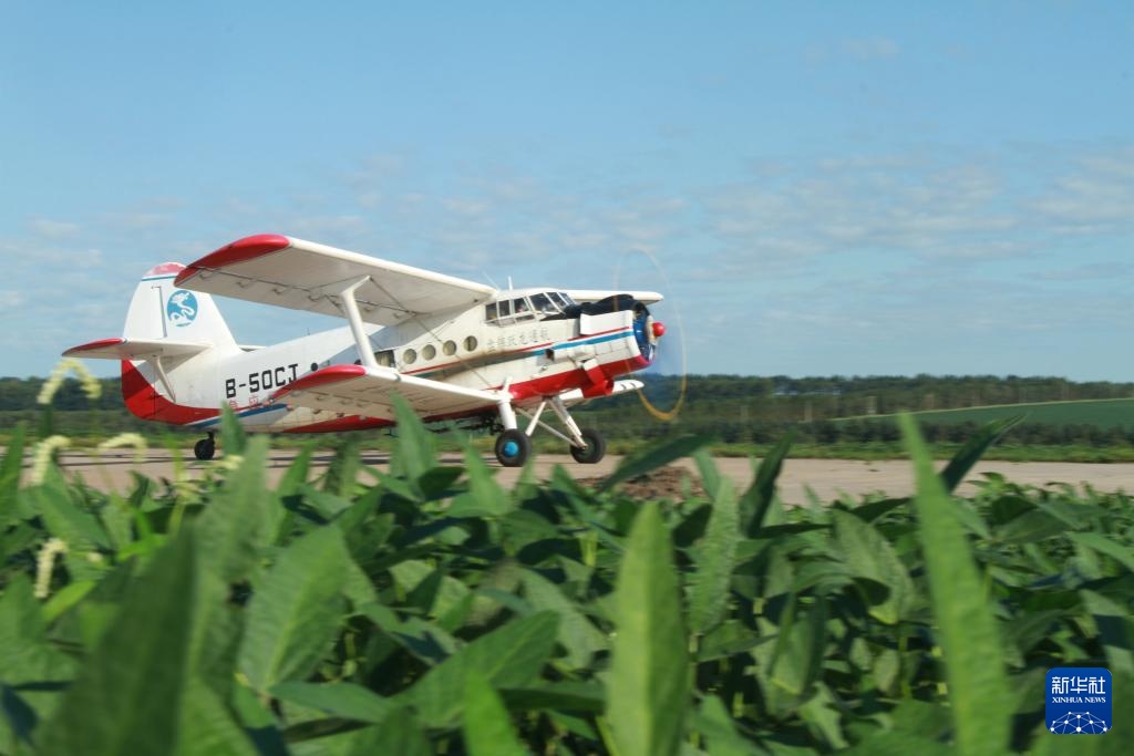 8月2日,农用飞机在黑龙江北大荒农业股份有限公司友谊分公司大豆地块进行航化作业。