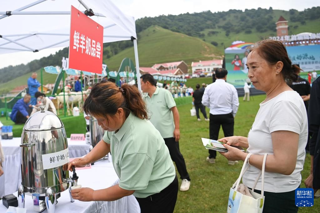8月2日,游客在陇县首届奶山羊大赛现场准备品尝鲜羊奶。