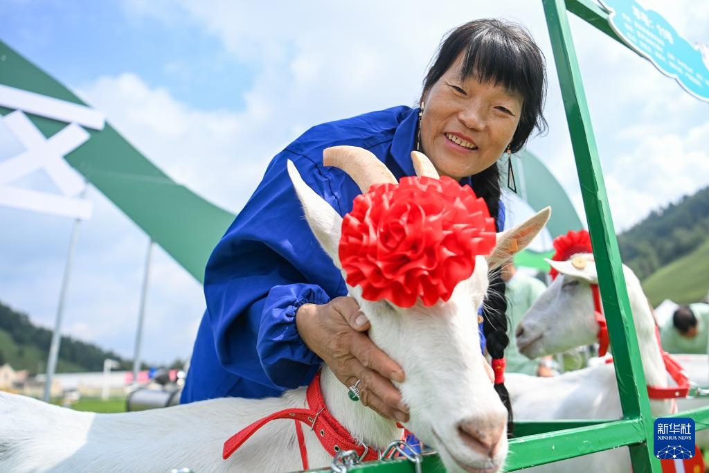 8月2日,参赛养殖户温静在现场安抚奶山羊,她的奶山羊最终获得亚军。