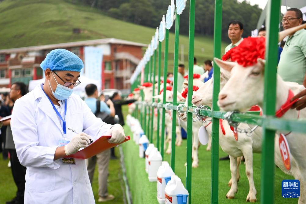 8月2日,工作人员对参赛奶山羊进行外貌评分。