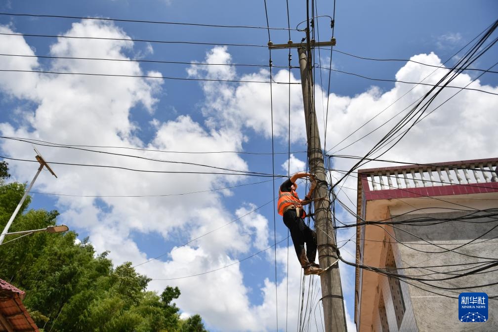 8月2日,湖南省通信建设公司工作人员在资兴市州门司镇白筱村更换通信电缆。