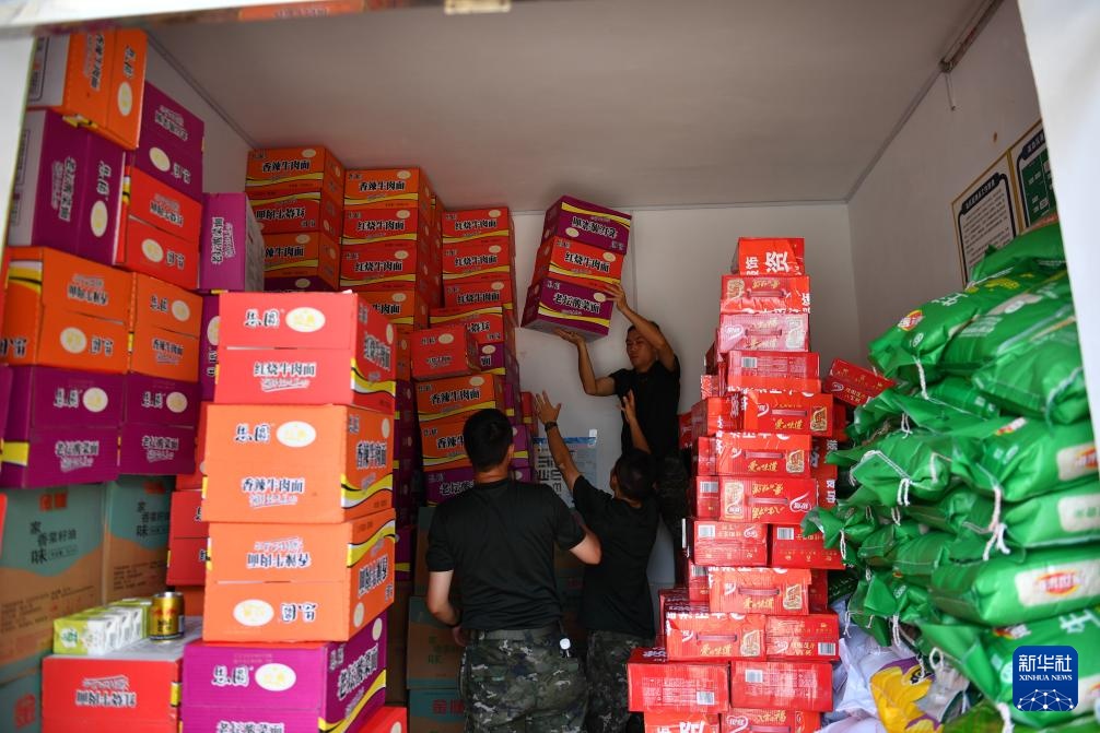 8月2日,救援人员在资兴市州门司镇白筱村整理生活物资。