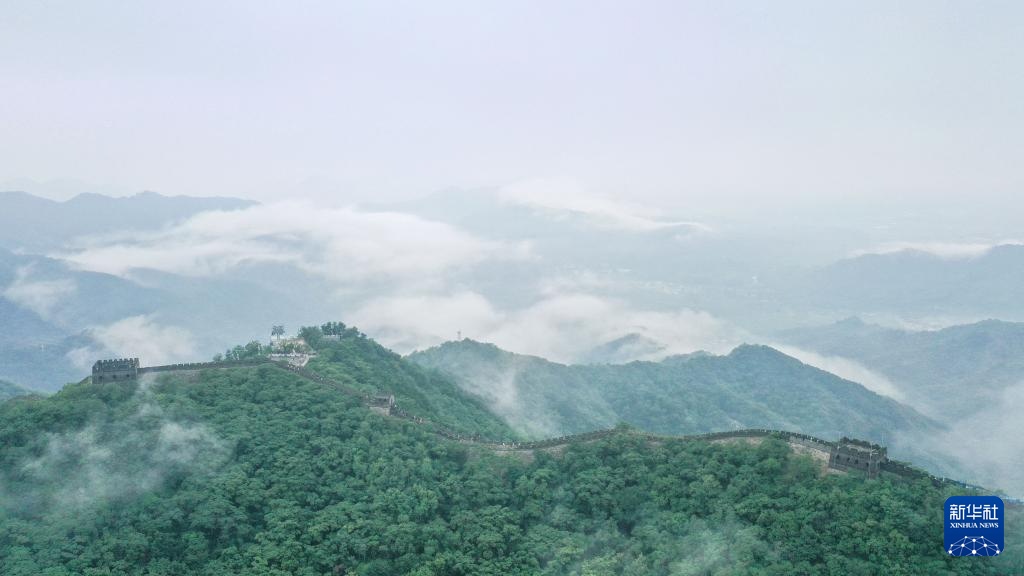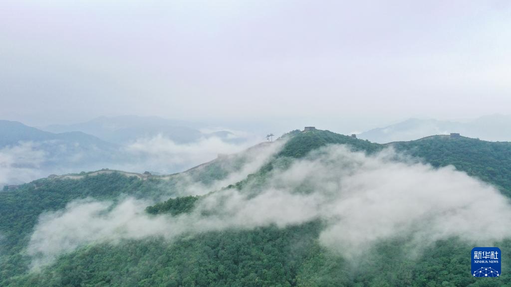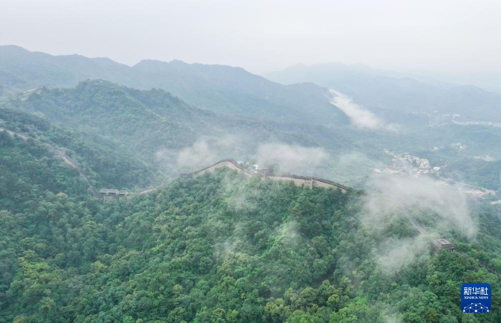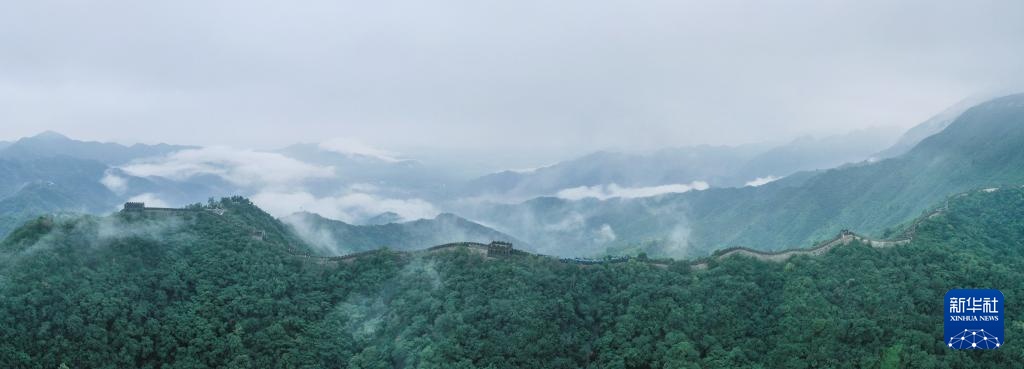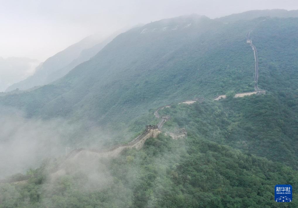 云雾缭绕的慕田峪长城(8月3日摄,无人机全景照片)。
