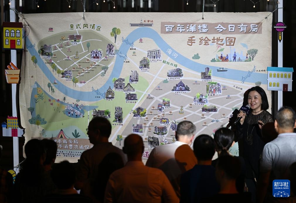 8月2日,在第五届天津夜生活节启动仪式现场,工作人员向游客介绍天津洋楼地图。
