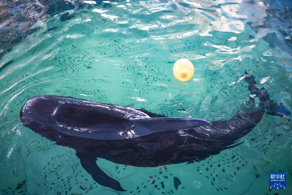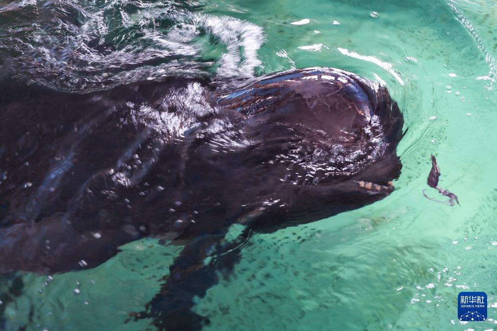 8月2日,短肢领航鲸“海莉”在海南三亚海昌生物保育中心的救助池内游动。
