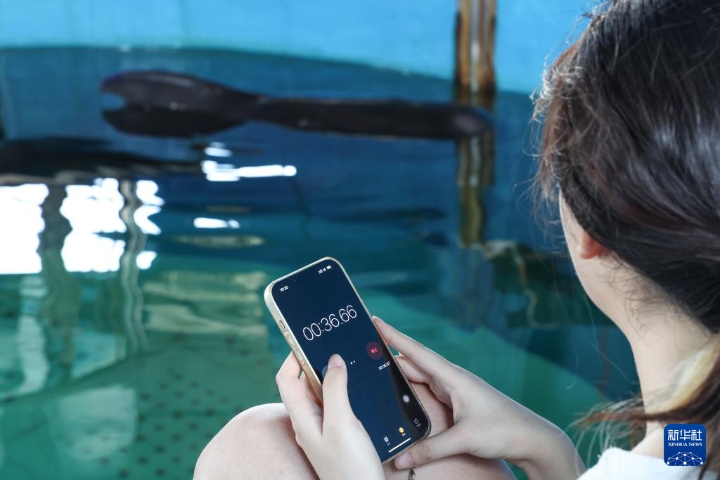 8月2日,在海南三亚海昌生物保育中心,志愿者在救助池边记录短肢领航鲸“海莉”的呼吸频率。