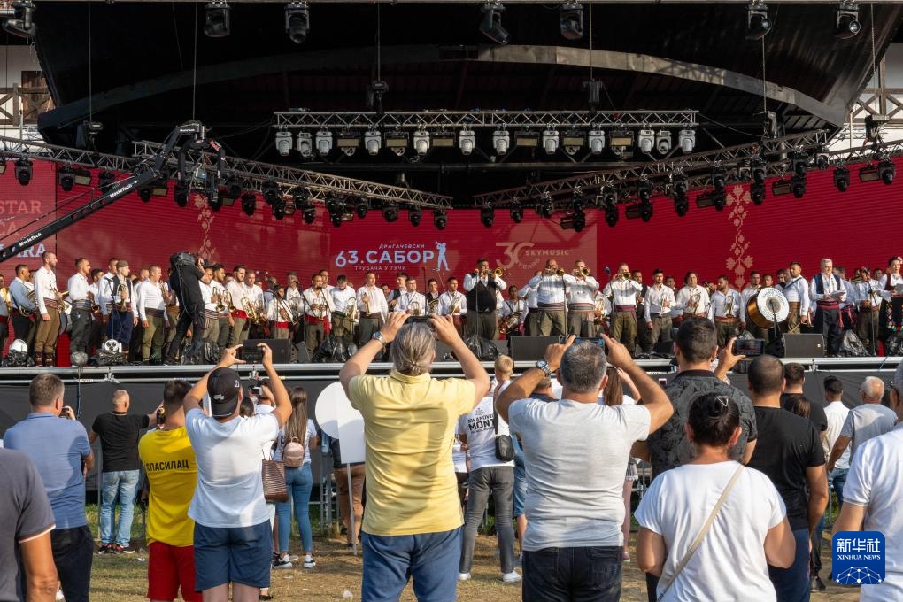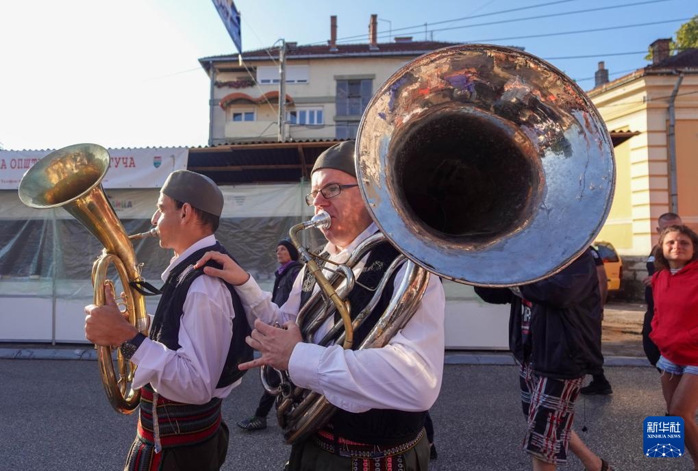 8月4日,在塞尔维亚古查小镇,铜管乐手进行街头表演。