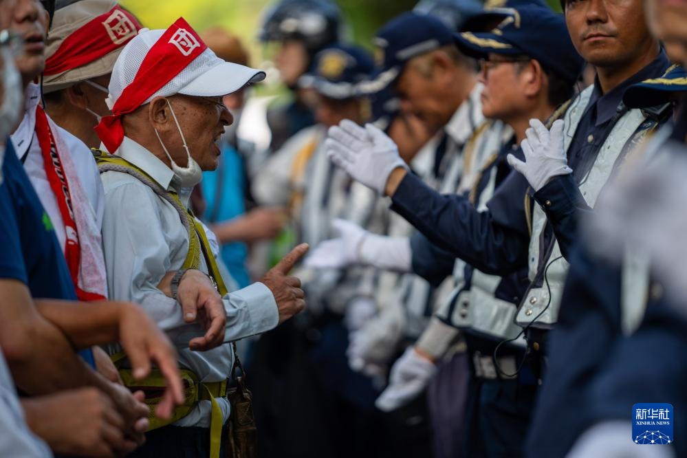 8月6日,参加抗议集会的民众在日本广岛和平纪念公园与安保人员对峙。